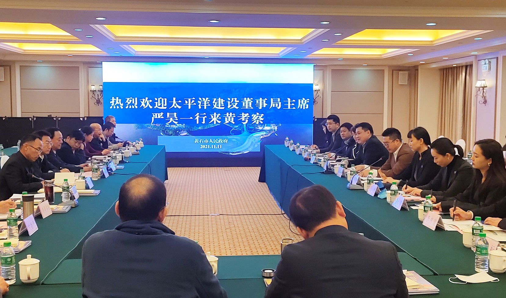 太平洋建設(shè)總裁宋少庭,中舒建設(shè)董事局主席王沫,中舒建設(shè)七集團董事局主席石又菱,未來城市副總裁章正良,太平洋建設(shè)副總裁王然,太平洋建設(shè)經(jīng)營中心總經(jīng)理劉非凡,中舒建設(shè)經(jīng)營中心總經(jīng)理王韻;黃石市政府秘書長胡敏,市招商服務(wù)中心、開發(fā)區(qū)·鐵山區(qū)主要負責人,市發(fā)改委、財政局、住建局、交通運輸局、水利和湖泊局、商務(wù)局、鄉(xiāng)村振興局、城發(fā)集團、東楚投資集團分管負責人;大冶市、陽新縣招商分管負責人;磁湖高新主要負責人參加會談。(文/圖 中舒建設(shè)文品中心)